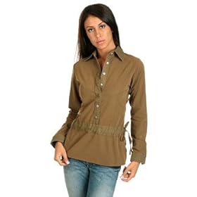 Ruffle trim along the 1/4 snap-front adds a touch of femininity to this great blouse. Thick woven cotton trims the collar and single button cuffs, while princess seaming and a side body zip creates a sexy silhouette. Sueded cotton finish. Machine wash. (Please note: this item runs quite small. Please order one size up for best fit.)