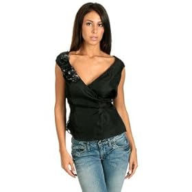 Welcome any dressy occasion in this elegant black silk double-layered blouse. The crossover front ties at the waist with a wide self belt. Black mesh and glitter flowers with center multifacted jet beads adorn the right side of the plunging neckline. Soft pleats on the sides and back, and elasticized cap sleeves finish this beautiful piece. Gentle machine cycle or dry clean